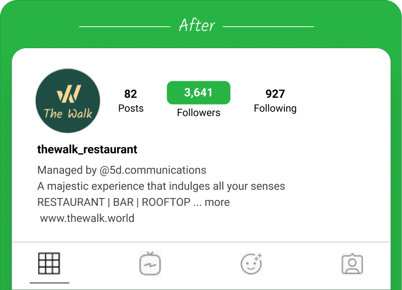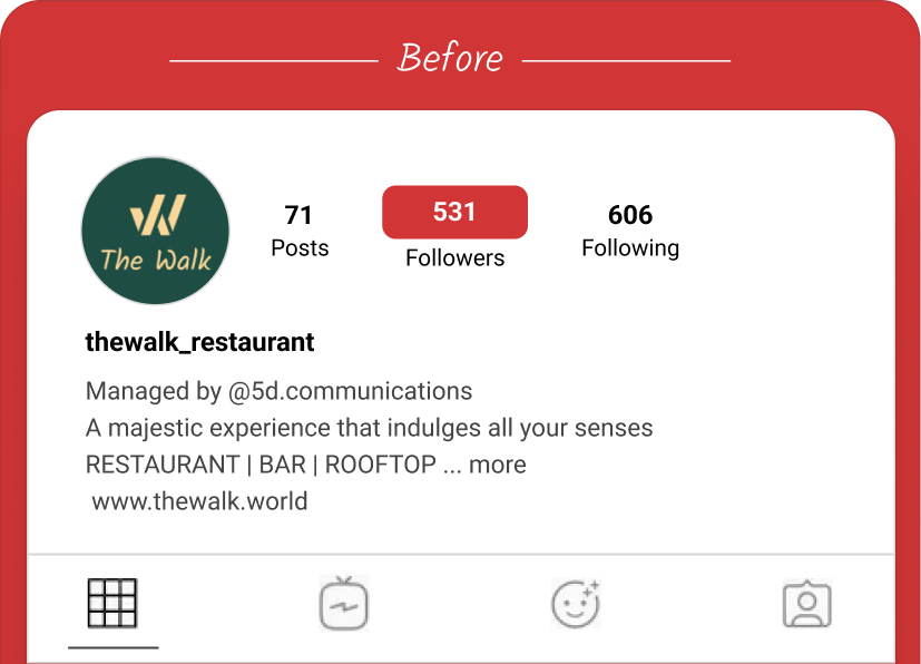 O Walk pediu ajuda à CrowdIgnite para melhorar as suas estratégias de crescimento de seguidores, tanto para encontrar novos potenciais clientes envolvidos, como para melhorar a posição do restaurante no Instagram em comparação com os seus concorrentes.